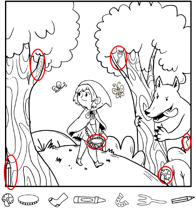 - Start with the obvious.Identify main elements like Little Red, the wolf, and the trees before focusing on smaller items.