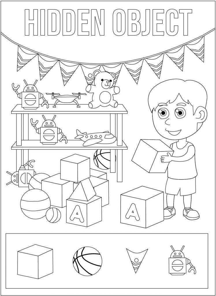 Step inside a cheerful playroom filled with toys, laughter, and mystery! At first glance, this picture looks like a normal day in a child’s room — blocks on the floor, robots on the shelves, and a teddy bear sitting proudly in the center. But look closer. Hidden among the toys and shapes are secret surprises waiting to be found. This isn’t just an ordinary drawing — it’s a hidden object challenge that invites you to explore, observe, and think like a detective in the world of play.