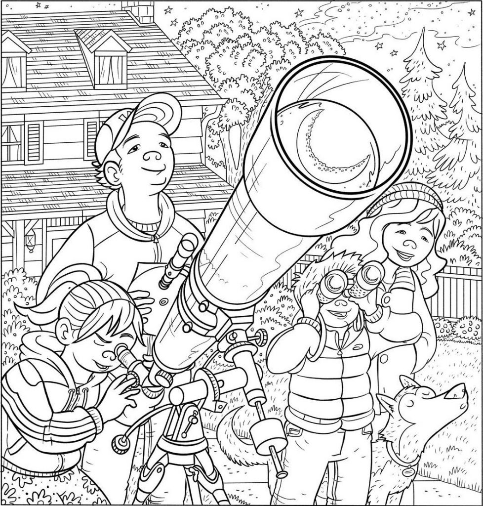 In the illustration, the joy of stargazing becomes even more meaningful because it’s shared. One child peers eagerly into the telescope, another uses binoculars, and the rest smile with delight. A family dog even tilts its head skyward, as though it wants to join in. This scene captures the magic of doing something together as a family.