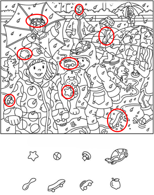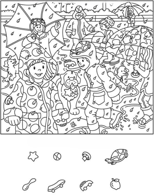 In the image, we see a variety of rain gear—polka-dot raincoats, oversized hoods, and umbrellas patterned with stars and shapes. The children look prepared but also playful, as if the gear itself is part of the game.