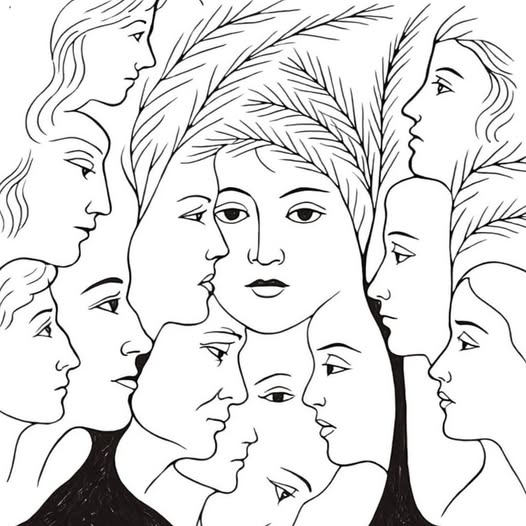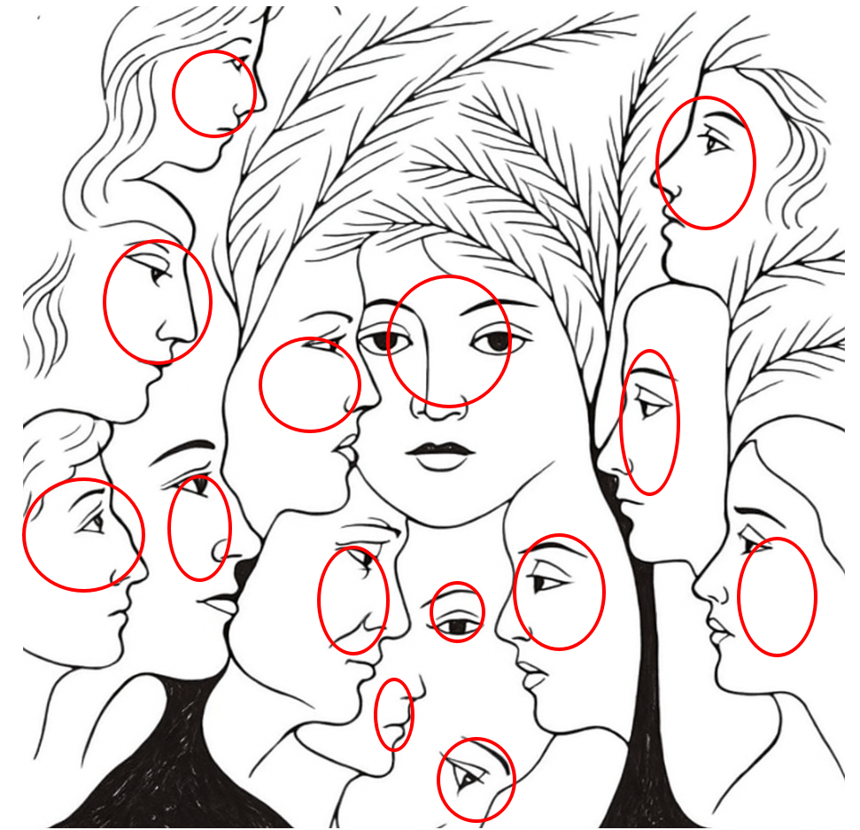 When you first look at this picture, you probably notice a few obvious faces. Maybe the larger one in the center grabs your attention, or the two symmetrical profiles facing each other along the edges. But with each passing moment, more faces begin to reveal themselves—some upright, others sideways, some hidden between lines that first appeared to be branches or shadows.