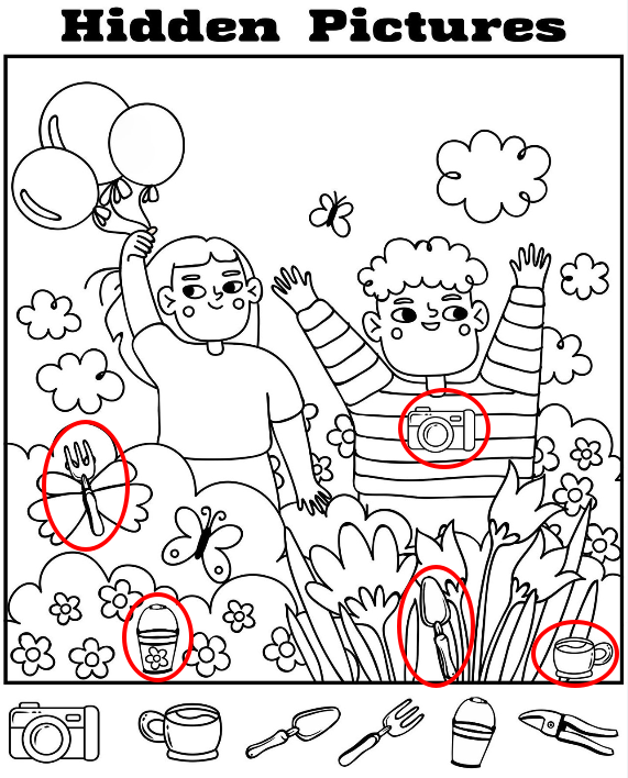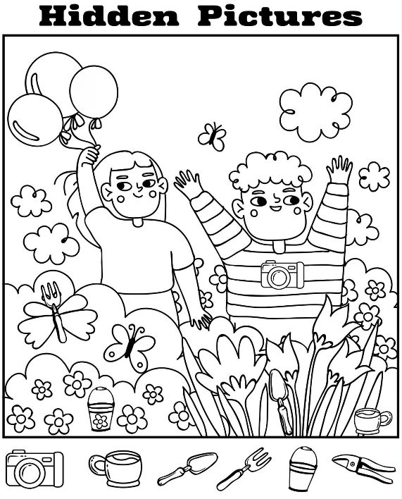 At first glance, this playful illustration feels like pure joy—two children standing in a colorful garden, surrounded by butterflies, balloons, and blooming flowers. One child proudly holds balloons, while the other sports a camera around the neck, ready to capture the moment. It’s a simple yet heartwarming scene of innocence and wonder. But there’s more than meets the eye. Hidden within the cheerful details are everyday objects cleverly disguised in nature, waiting for keen eyes to spot them.
