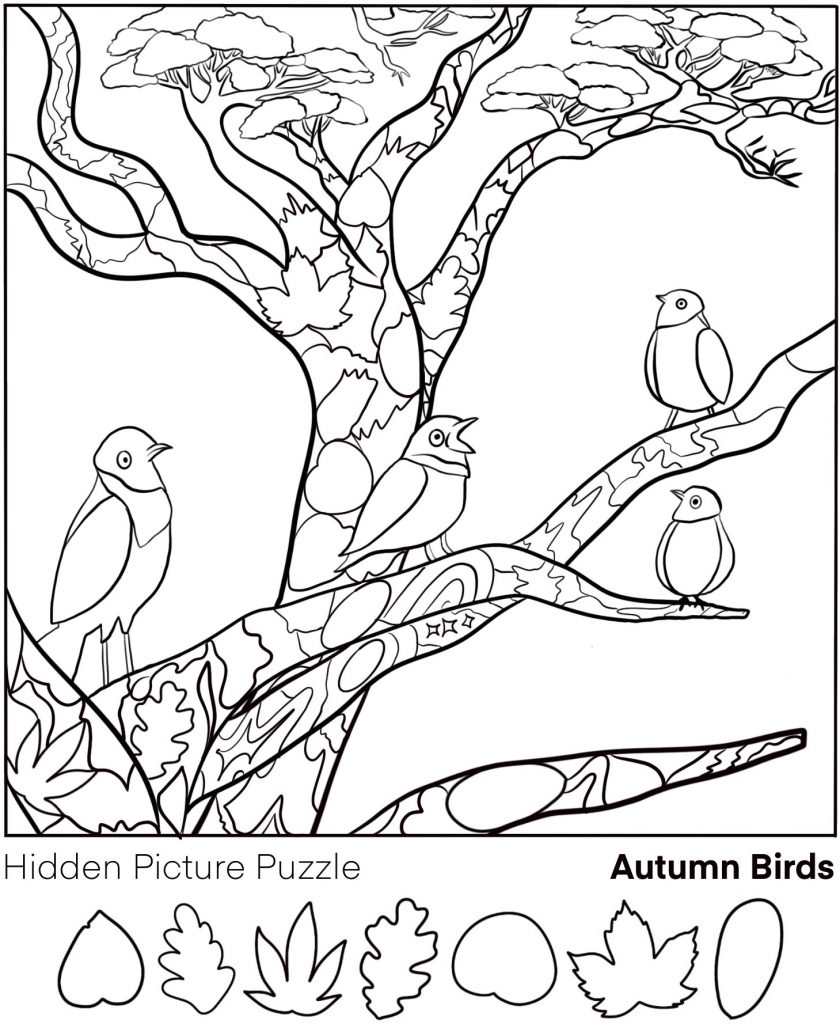 At first glance, this picture looks simple: four birds perched on the branches of a large tree. But if you linger for a moment, you’ll notice there’s more to it than meets the eye. The tree itself isn’t just bark and branches—it’s alive with patterns, shapes, and designs that seem to tell a story of their own. From stars to leaves, waves to swirls, the trunk and branches feel like a puzzle waiting to be solved. This is the magic of hidden object illustrations: they invite you to look deeper, to see beyond the obvious.