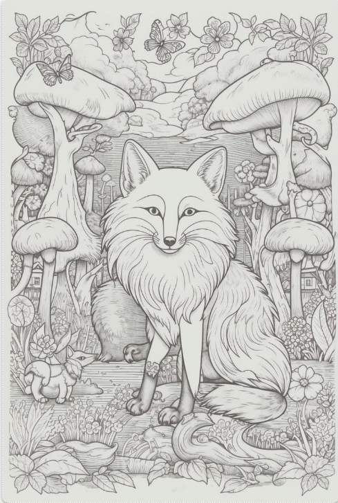 Have you ever wandered into a forest and felt like you stepped into a fairy tale? Our illustration captures that feeling perfectly: a graceful fox sits amidst towering mushrooms, delicate butterflies drift overhead, and hidden critters peek through the foliage. This isn’t just a coloring page—it’s an invitation to explore a fantastical world where nature’s wonders and your imagination collide.