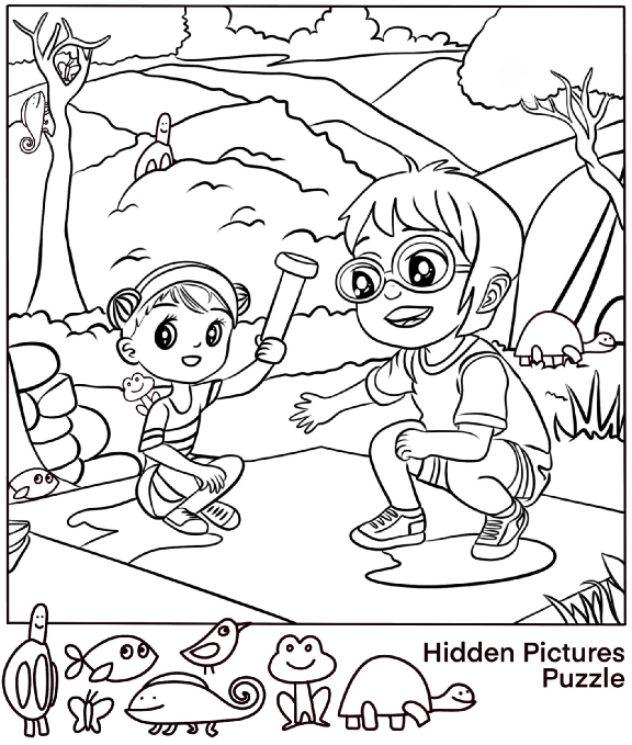 Beyond the children’s excitement, the background tells its own story. A chameleon clings to a tree branch, perfectly camouflaged. A tiny turtle rests near the stream, while a bird perches quietly in the distance. Each small creature adds depth and richness to the scene, making it feel alive and full of movement.