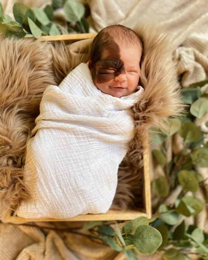 Newborn girl Winry wrapped in a blanket smiling, Photo Credit: nicolelucashall/Instagram
