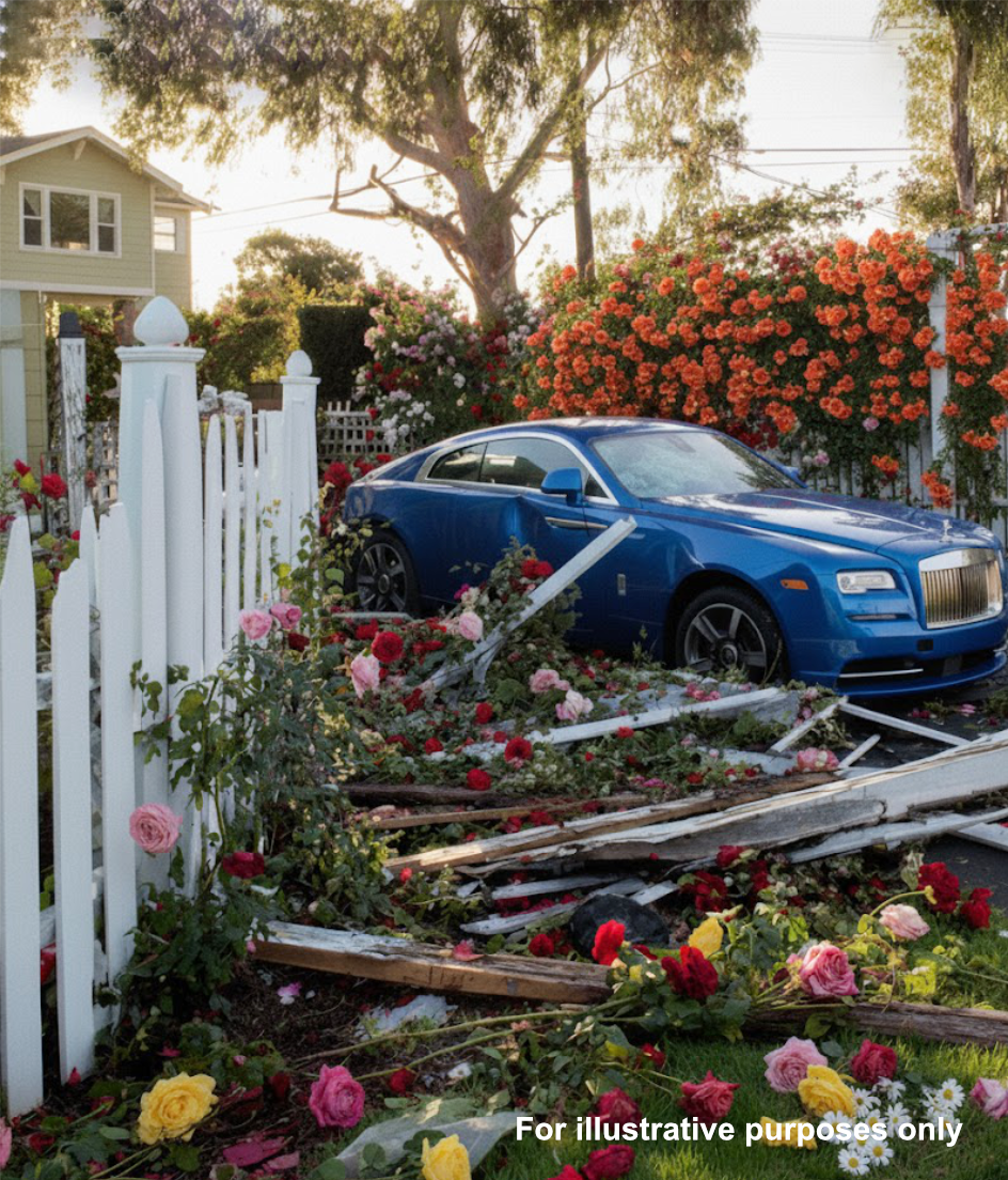 My fence, older than most homes on this street, lay in pieces! Splintered planks were scattered across the lawn, some stuck in the bushes. And lodged right in the wreckage was a gleaming red Rolls-Royce, its rear end still partly in my yard.