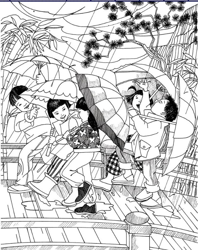 The background, with trees swaying and raindrops falling, adds depth to the story. It shows how nature becomes a stage for these children’s adventures. The rain isn’t an obstacle—it’s an invitation. The trees, the wooden deck, the stormy sky all come together to highlight how deeply connected kids are with their environment when given the freedom to explore.