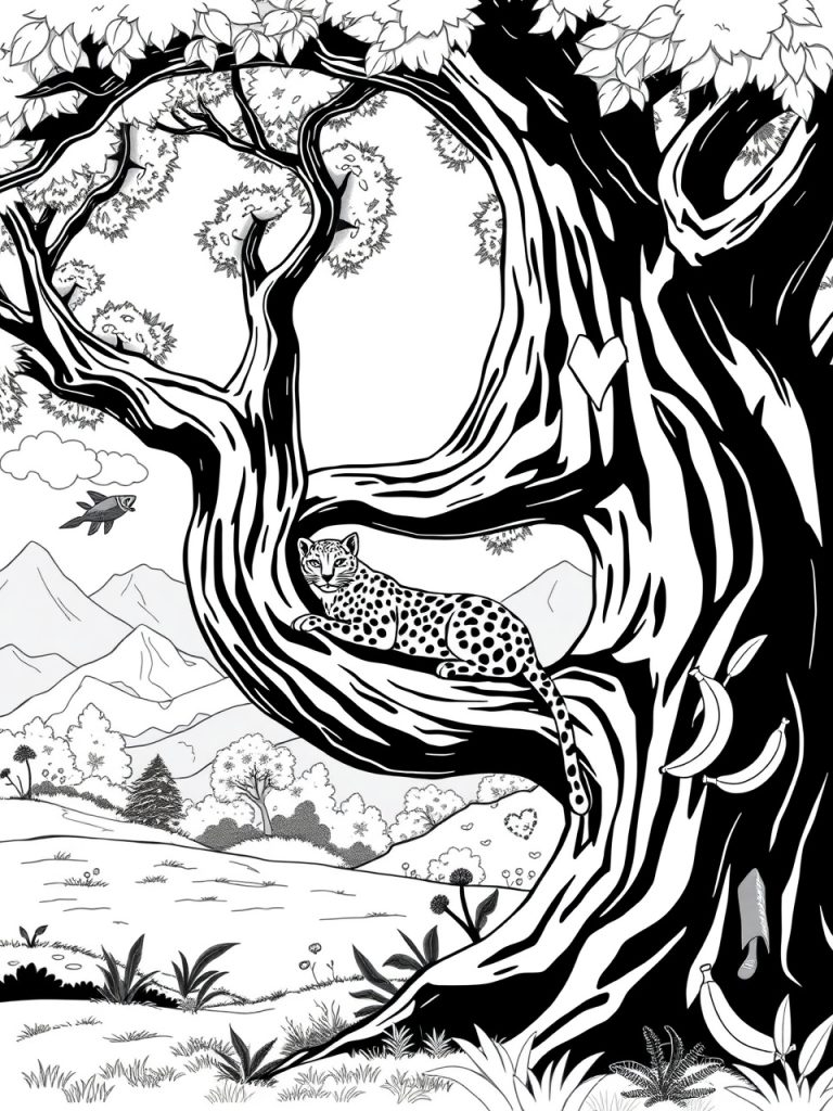 Have you ever wished you could step into a lush jungle and meet its hidden inhabitants? This detailed coloring page brings that adventure right to your fingertips! With a sturdy old tree dominating the foreground, winding branches that seem to reach for the sky, and a sleek leopard lounging like royalty, this illustration is a playground for your imagination. It’s not just a page to fill with color—it’s an invitation to explore, create, and learn.
