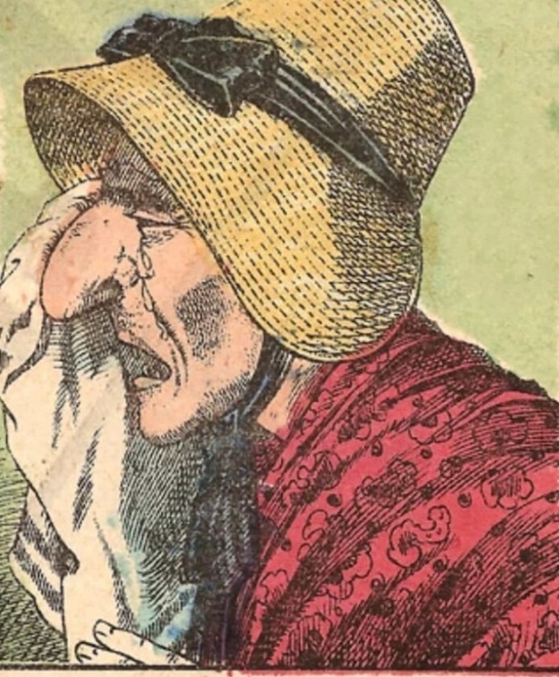Considering the era suggested by the straw hat and shawl, this image likely hails from a time when public displays of female emotion were both expected and constrained. In many historical contexts, women bore the brunt of communal grief—mourning lost loved ones, enduring hardships, or shouldering family responsibilities—yet they often had limited outlets to express feelings. Illustrations like this validated their sorrow while also shaping cultural norms: crying was both a morally acceptable gesture of empathy and—a surprising twist—a subtle form of resilience. By showing tears, a woman could signal depth of feeling and moral virtue.