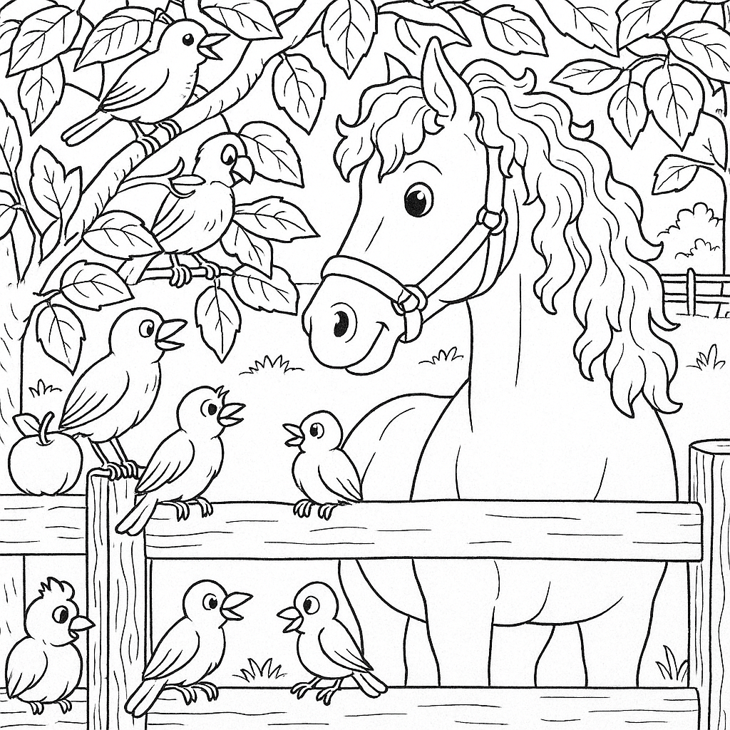 This simple yet profound illustration of a horse and birds offers valuable lessons in peaceful coexistence. The animals interact with each other in a way that highlights the harmony present in nature. Their peaceful demeanor encourages us to reflect on how we interact with the world around us.