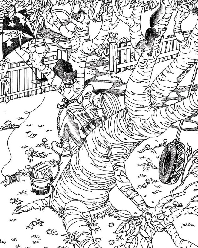 This scene also highlights the quiet company of animals. A curious cat balances on a branch, its eyes fixed on something unseen, while a squirrel scampers close by, tail flicking playfully. Even the birds in the higher branches seem to add their voices to the story unfolding below.
