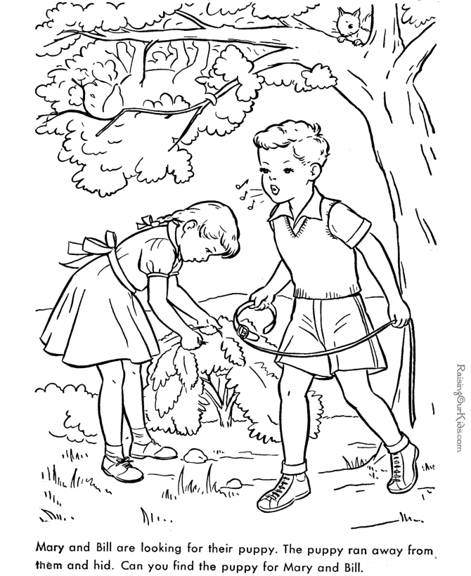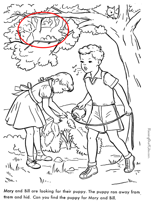 The setup is simple yet delightful: Mary and Bill have lost their puppy. He has scampered away and hidden somewhere in the scene, leaving the kids to search. Bill is whistling, leash in hand, while Mary bends down to peek into the bushes. You can almost feel their concern and hope as they try to track down their furry friend. But of course, the puppy is right there—just not where you’d expect him to be.
