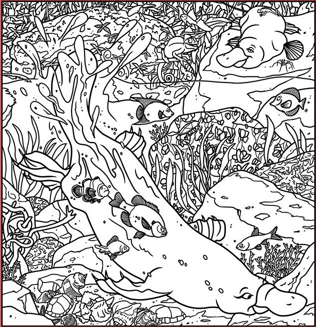 Front and center in the image, the platypus glides across the underwater world. Its unusual shape already makes it fascinating, but here, it’s more than just an animal—it’s also part of the illusion. Look at its curves, the shading, and the patterns along its body. Could those spots or lines be hiding extra figures? Could its tail or bill conceal a cleverly disguised creature?