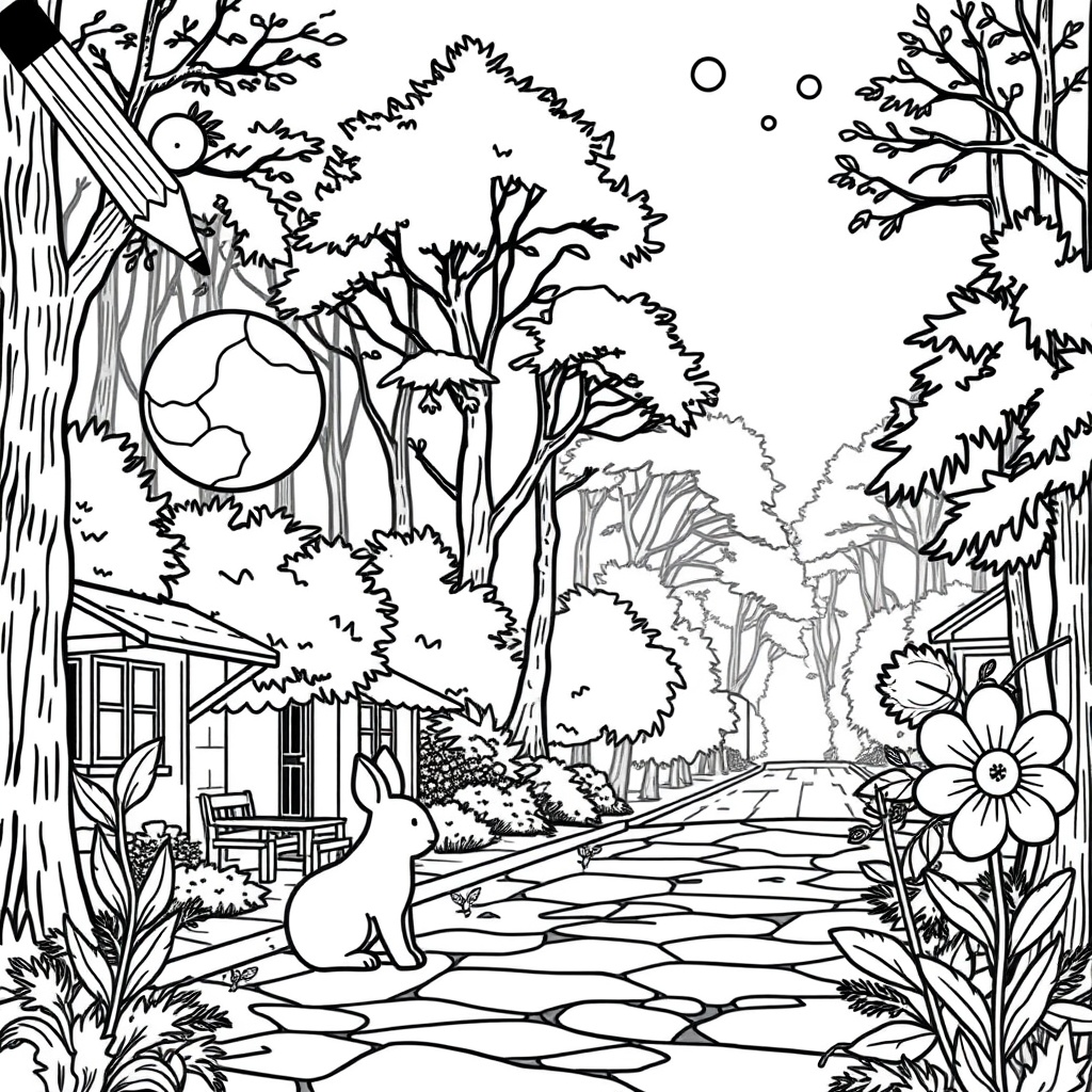 Let’s take a closer look at the image. The setting is a peaceful nature path, lined with trees, flowers, and shrubs. A curious rabbit sits in the foreground, seemingly observing the world around it. In the background, there are distant trees and a hint of a faraway landscape. Everything seems serene, but as you start analyzing the scene, you’ll quickly discover that things aren’t as straightforward as they appear.