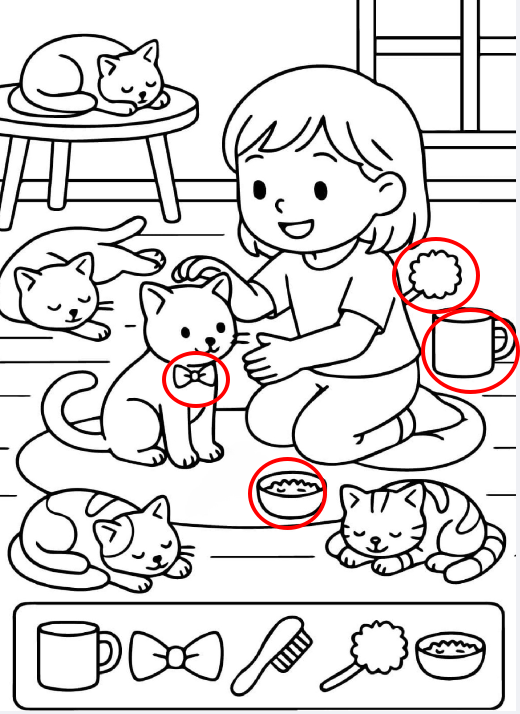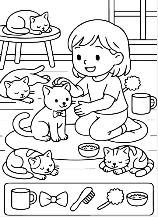 At first glance, this sweet illustration feels like a warm hug. A child kneels on the floor, gently petting a kitten, while several cats nap peacefully around the room. Everything about the scene whispers comfort—soft lines, calm expressions, and a quiet moment shared between a child and her furry friends. But look a little closer, and you’ll realize this isn’t just a cute picture. It’s a hidden object puzzle designed to sharpen attention, spark curiosity, and soothe the mind.