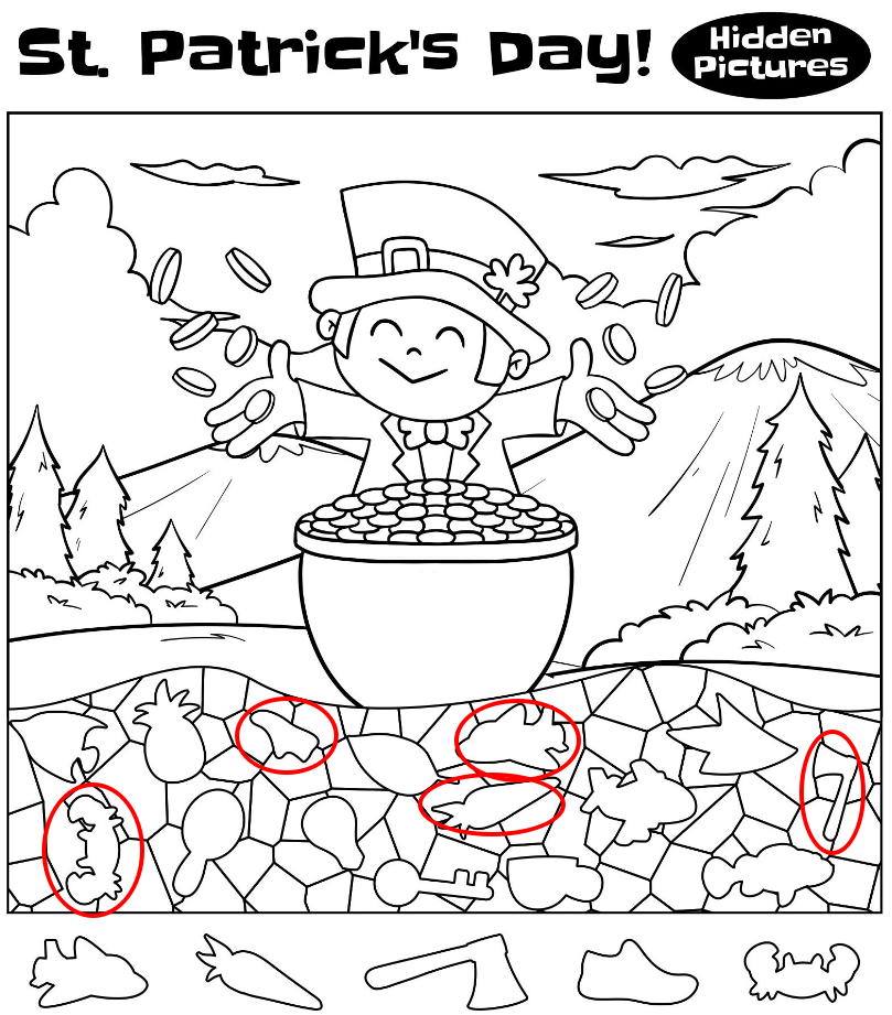 When you think of leprechauns, you probably picture a cheerful little character guarding a pot of gold at the end of the rainbow. But in this playful puzzle, the scene comes alive in a whole new way. A happy leprechaun tosses coins into the air, standing proudly behind a pot overflowing with treasure. At first glance, it looks like a classic St. Patrick’s Day illustration, but look closer—you’ll discover that the real challenge is hidden in the ground below, where shapes of objects and animals wait to be found.