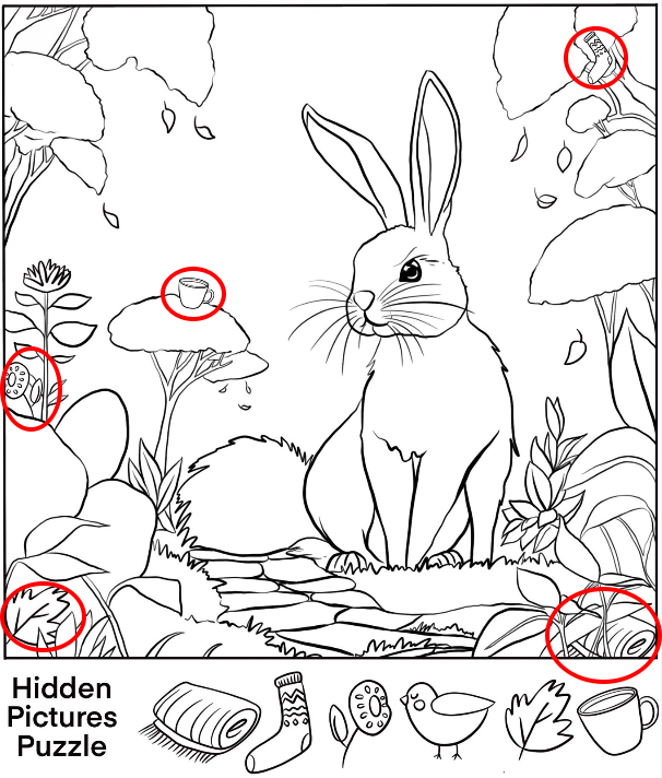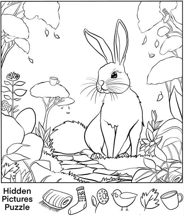 There’s something enchanting about hidden object illustrations. At first glance, the scene seems simple—a curious rabbit sitting in a quiet woodland clearing. But as you let your eyes wander, you realize the picture is filled with playful secrets. Everyday objects are tucked into the trees, mushrooms, and leaves, cleverly disguised to challenge your perception. This is no ordinary drawing—it’s a puzzle that turns a peaceful moment in nature into a delightful adventure of discovery.