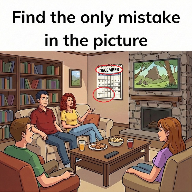 👉 December has 31 days, but the calendar in the picture only goes up to 30, so December 31 is missing.