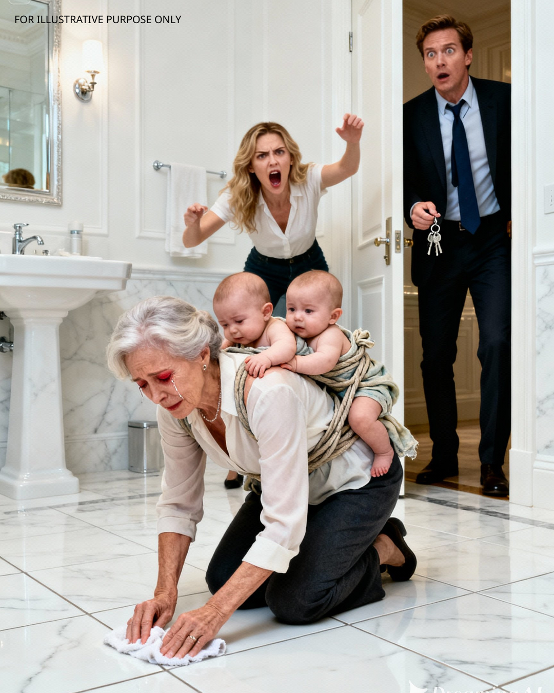 Not on a mat. Not on a cushion. Directly on the cold, polished marble floor. Her back rounded, shoulders shaking, hands red and raw as she scrubbed a corner behind the toilet with a sponge that smelled like something that burns your nose just by breathing.