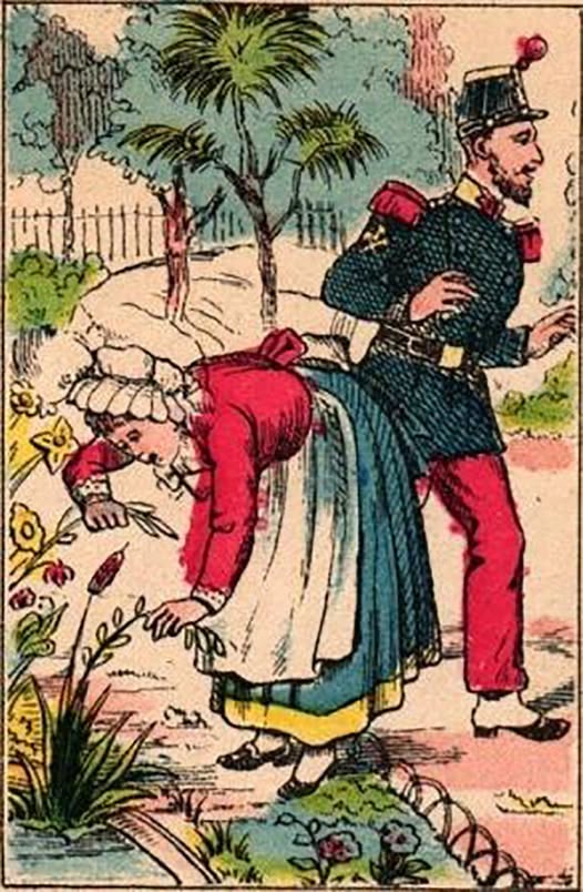 The Charming Encounter: Soldier and Flower Picker in a Vintage Illustration