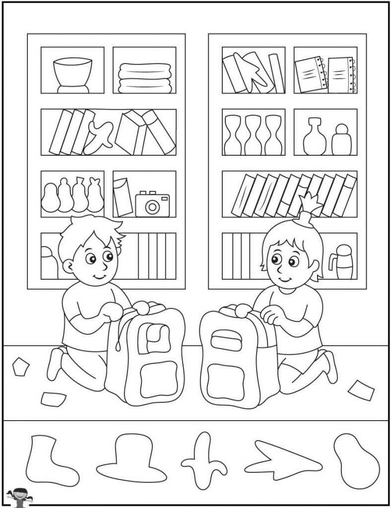 At first, you see two kids packing backpacks in a library. But once you know hidden shapes are waiting, your eyes start scanning differently. Suddenly, every book spine, every decorative vase, and every shelf corner becomes a possible hiding spot.