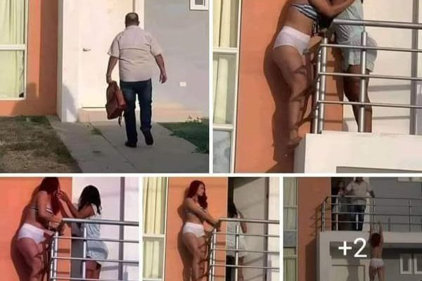 The incident occurred in what appears to be a residential complex. In the photographs, a man wearing a beige shirt and carrying a briefcase can be seen walking toward the apartment door. Meanwhile, from the second-floor balcony, two women—one in underwear and the other in pajamas—watch the man’s arrival with obvious concern.