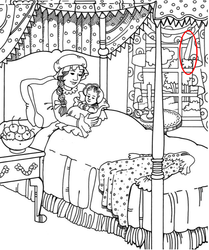 - Follow the lines.Trace the outlines of the bed canopy, curtains, and folds of fabric — these often hide small artistic details or patterns.